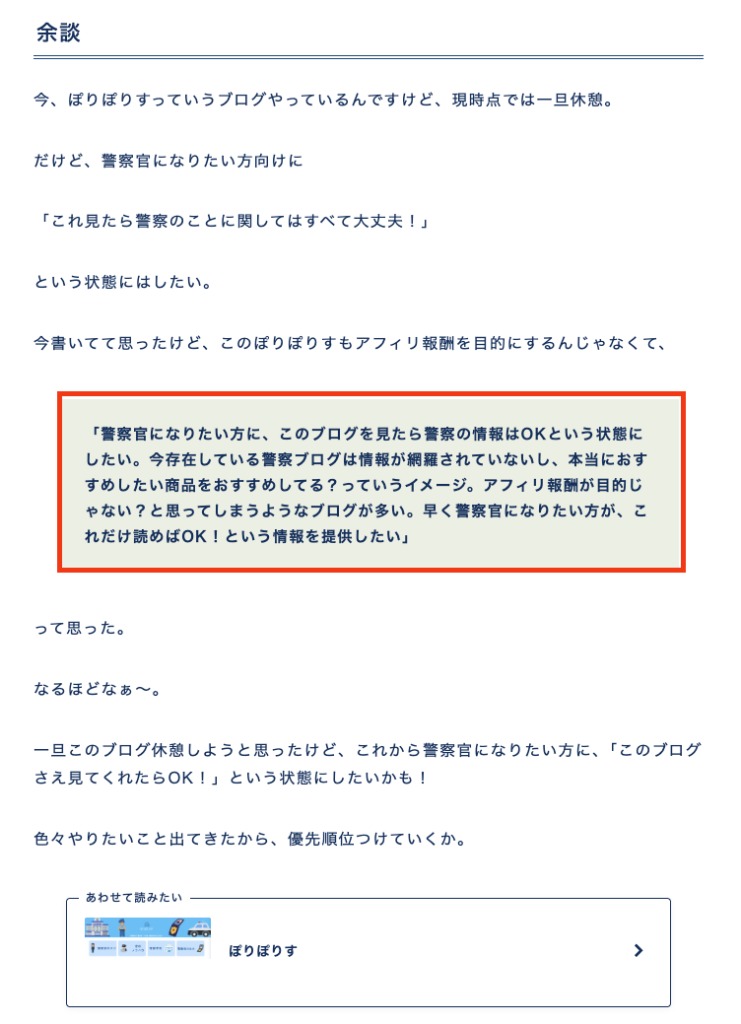 「結局、今までお金を基準にしてたから動けなかった。ガチで読者さんに良い情報を届けないと、他のサイトとかで変な情報を掴んじゃうよ。じゃぁ、警察官情報を網羅するサイトを完成させないと!」